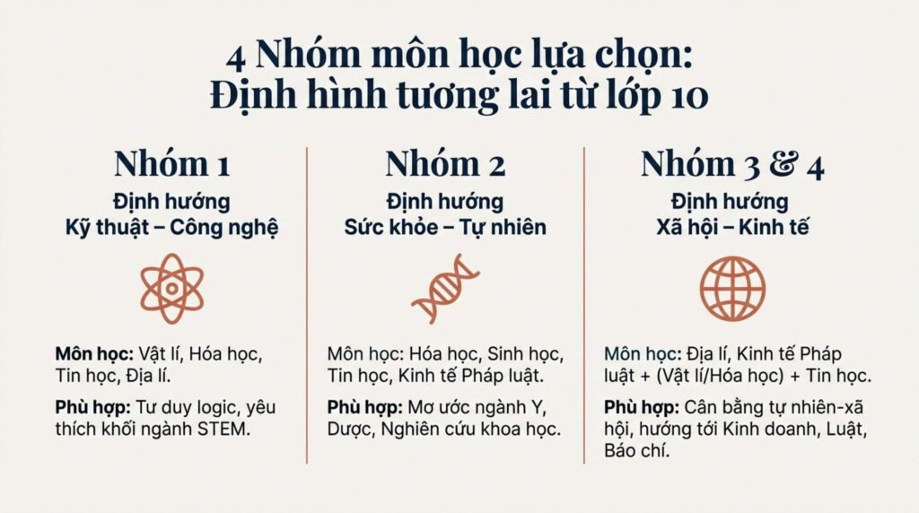- Nhóm 3 & 4 (Định hướng Xã hội – Kinh tế): Chú trọng vào Địa lí, Kinh tế Pháp luật, kết hợp thêm Vật lí hoặc Hóa học và Tin học để tạo ra sự cân bằng, phù hợp với các bạn muốn theo đuổi ngành kinh doanh, luật hay báo chí…