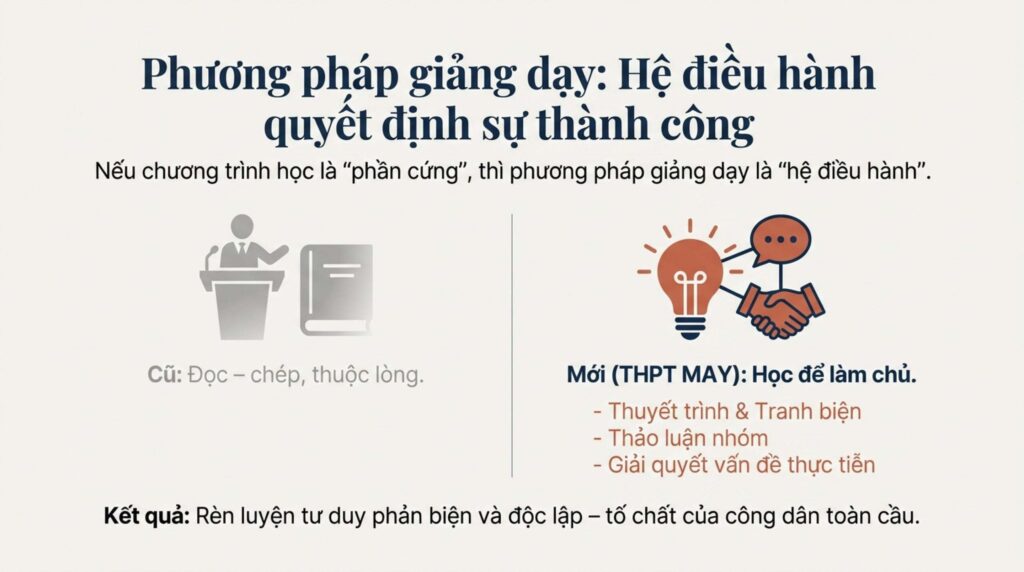 Nếu chương trình học là “phần cứng” thì phương pháp giảng dạy chính là “hệ điều hành” quyết định sự thành công của học sinh. Tại hệ lớp Tiêu chuẩn của THPT May, nhà trường kiên quyết từ bỏ lối dạy đọc – chép truyền thống. Thay vào đó là một môi trường học tập năng động, lấy học sinh làm trung tâm.