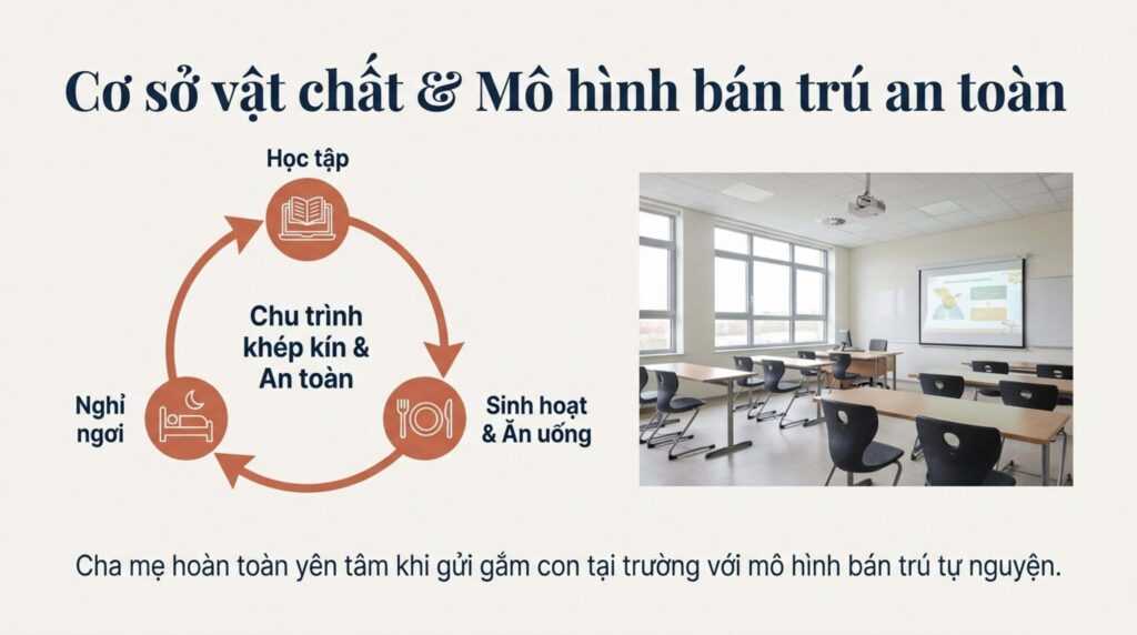 Về cơ sở vật chất, các phòng học được trang bị hiện đại, hỗ trợ tối đa việc ứng dụng công nghệ thông tin vào giảng dạy. Bên cạnh đó, mô hình bán trú tự nguyện giúp cha mẹ hoàn toàn yên tâm về việc sinh hoạt, ăn uống và nghỉ ngơi của các con tại trường, tạo nên một chu trình khép kín, an toàn và khoa học.