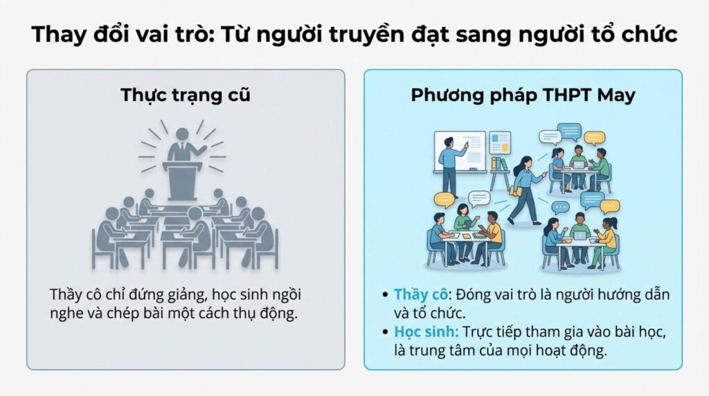 Trong mỗi giờ học, thầy cô không còn là người chỉ đứng giảng, còn học sinh chỉ ngồi nghe và chép bài. Ở THPT May, thầy cô đóng vai trò hướng dẫn và tổ chức, để học sinh trực tiếp tham gia vào bài học.
