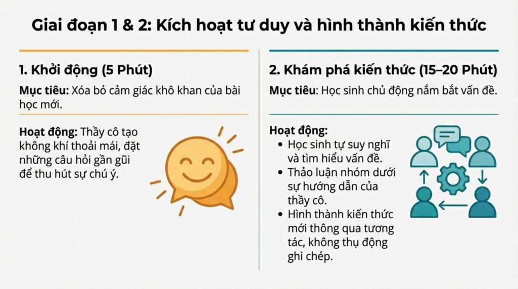 - Khám phá kiến thức (15–20 phút): Học sinh tự suy nghĩ, thảo luận, tìm hiểu vấn đề dưới sự hướng dẫn của thầy cô, từ đó hình thành kiến thức mới.