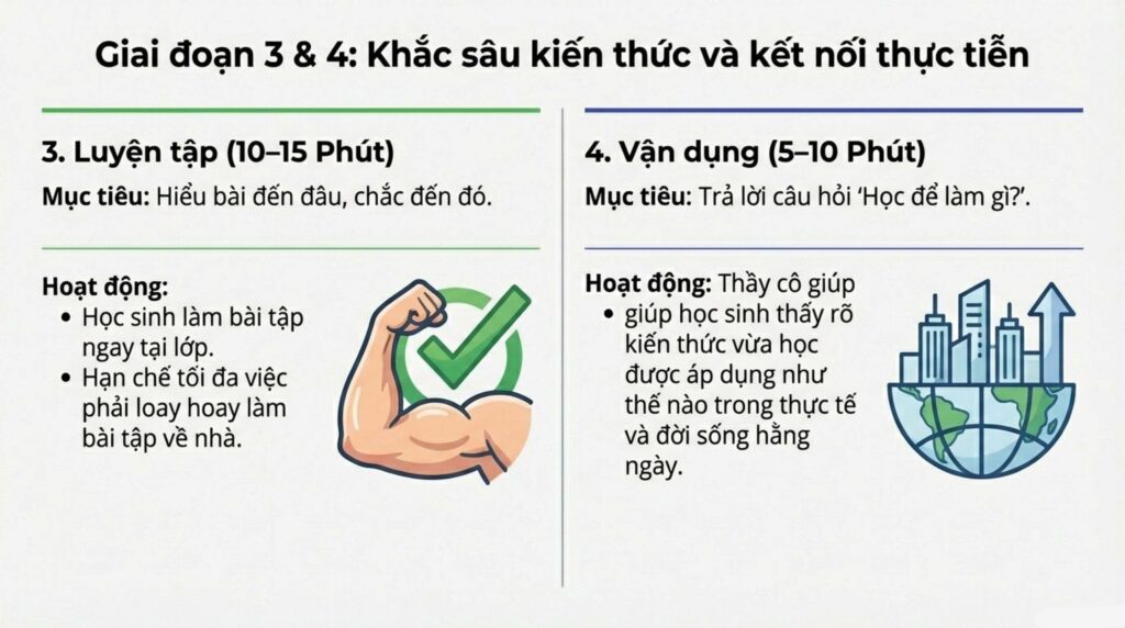 - Vận dụng (5–10 phút): Thầy cô giúp học sinh thấy rõ kiến thức vừa học có thể áp dụng như thế nào trong thực tế và trong đời sống hằng ngày.