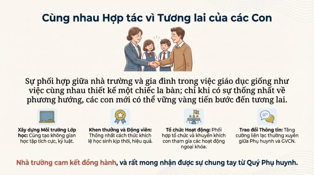 Sự phối hợp giữa nhà trường và gia đình trong việc giáo dục giống như việc cùng nhau thiết kế một chiếc la bàn; chỉ khi có sự thống nhất về phương hướng, các con mới có thể vững vàng tiến bước đến tương lai.