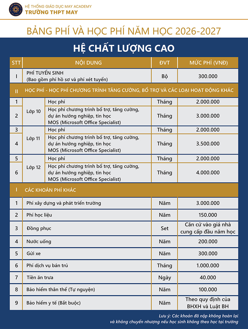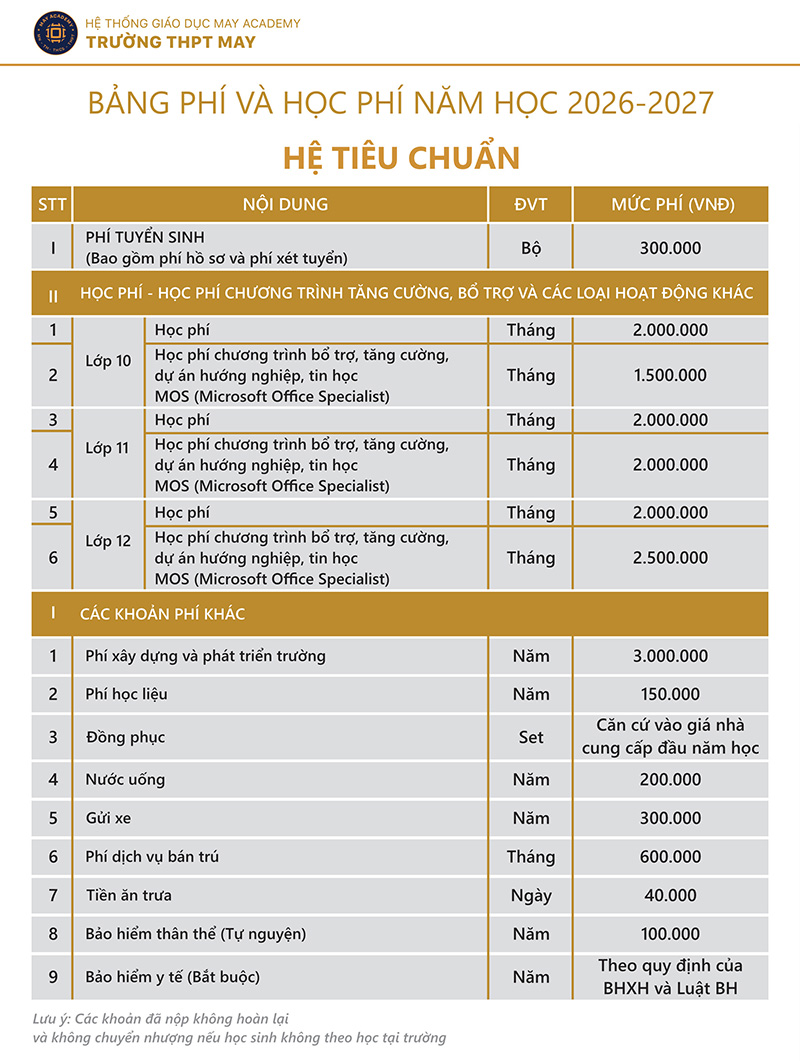 – Xét tuyển theo học bạ + phỏng vấn trực tiếp tại trường THPT MAY.